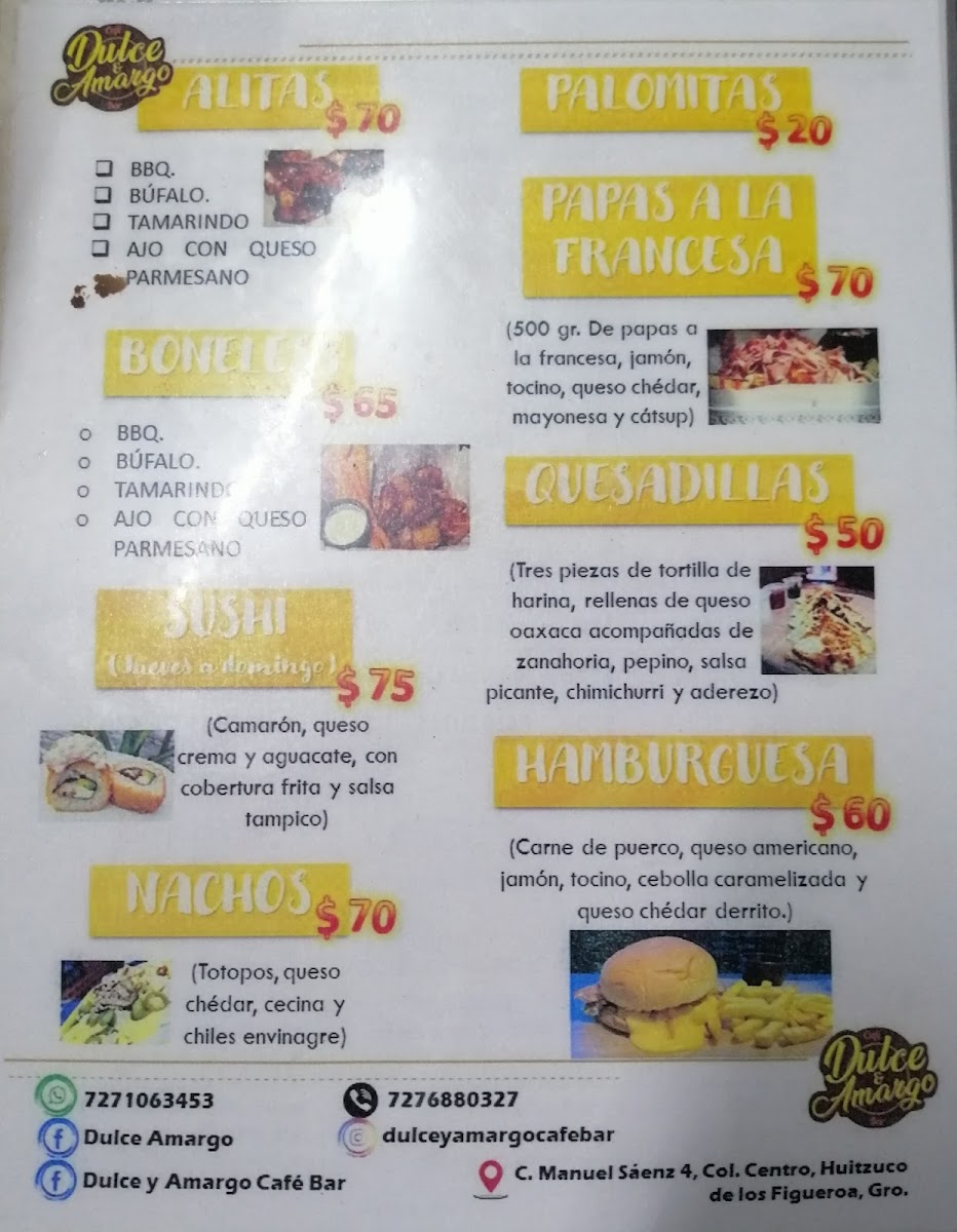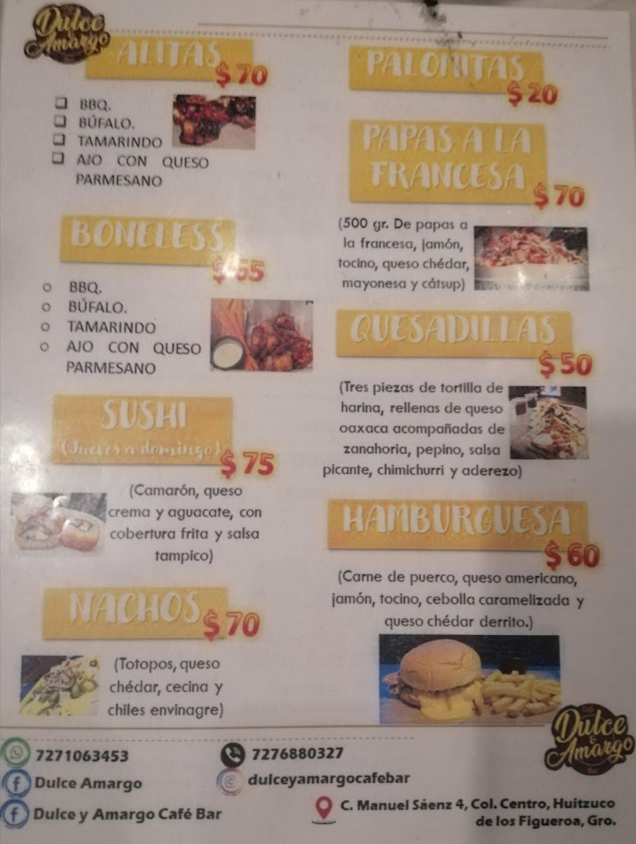 One of the standout features of Dulce y Amargo is their renowned alitas (chicken wings), a local favorite that has garnered rave reviews from patrons. Whether you’re craving the classic buffalo style or something more adventurous, these wings promise to deliver a burst of flavor with every bite. Pair them with a cerveza fría (cold beer) or a unique frappe to elevate your dining experience.
